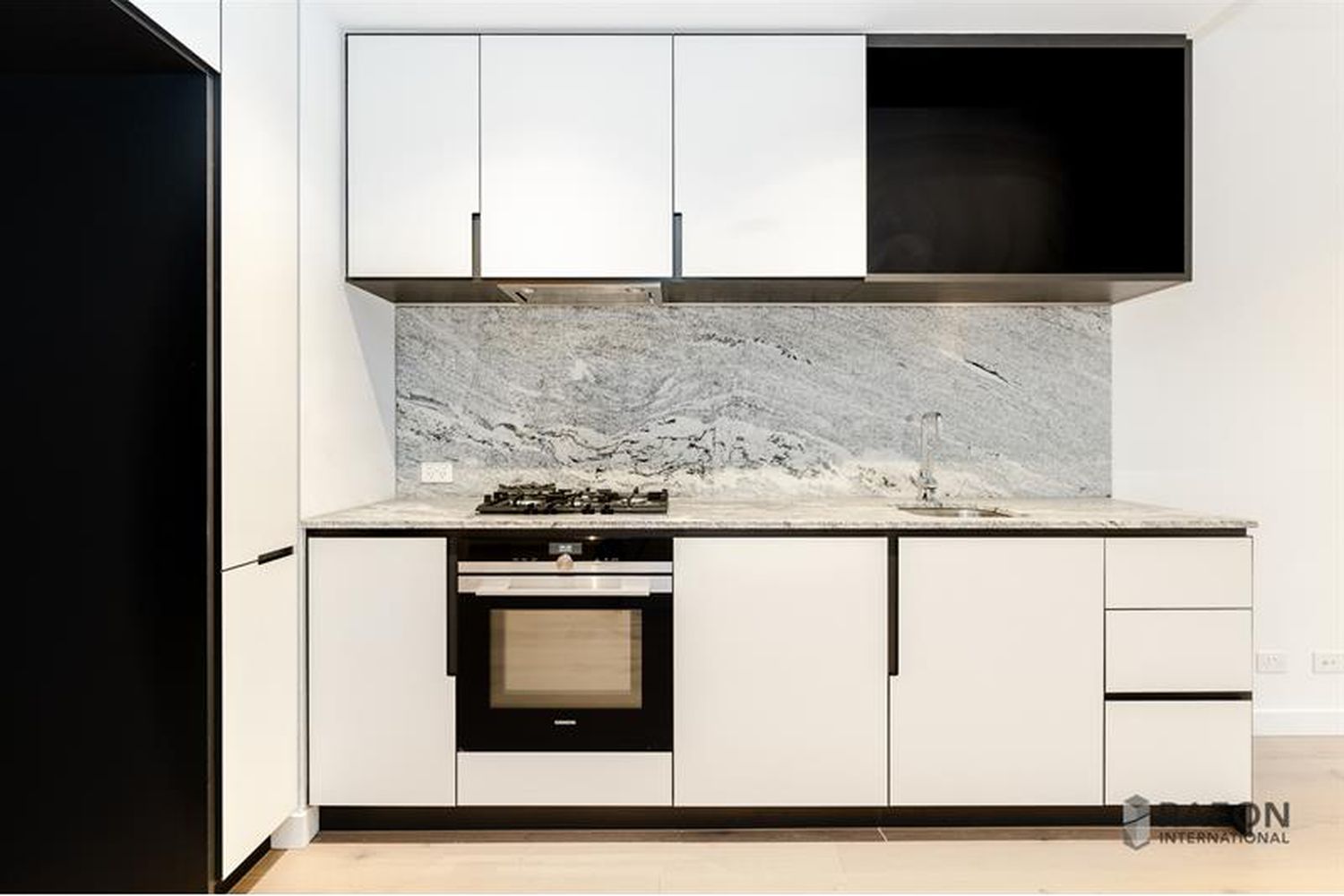 Kitchen equipped with unique marble splashback with top-of-the-range kitchen appliances, dishwasher and LED light strip to give the kitchen that extra WOW factor.