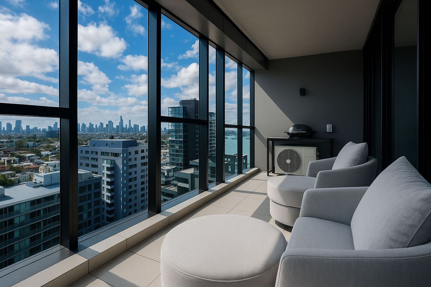 The practical floorplan offers a light-filled open plan living and dining area that seamlessly opens up to a spacious private balcony capturing breathtaking city skyline views – perfect for enjoying morning coffee or evening entertaining. The contemporary kitchen features stone benches, premium Miele stainless steel appliances, and plenty of storage.