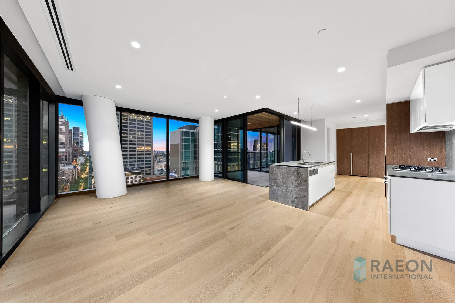 Perched high above the city and enjoying a desirable north-facing orientation, the apartment is bathed in abundant natural light throughout the day. Framed by dramatic floor-to-ceiling glazing, the expansive living domain captures sweeping outlooks over Collins Street and Bond Street, while the corner aspect introduces a captivating sense of openness, volume and connection to the surrounding cityscape. From the living area, a glimpse of the river from the side aspect adds a further layer of beauty to this already impressive setting.